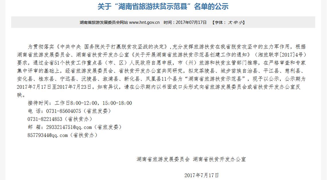 为贯彻落实《中共中央国务院关于打赢脱贫攻坚战的决定》,充分发挥旅游扶贫在我省脱贫攻坚中的主力军作用,根据湖南省旅游发展委员会、湖南省扶贫开发办公室《关于开展湖南省旅游扶贫示范县创建工作的通知》(湘旅联字[2017]4号)要求,通过全省51个扶贫工作重点县(市、区)人民政府自愿申报,市(州)旅游和扶贫主管部门推荐,在严格审查和专家集中评审的基础上,经省旅游发展委员会、省扶贫开发办公室共同研究,拟定茶陵县、城步苗族自治县、平江县、慈利县、安化县、桂东县、宁远县、沅陵县、溆浦县、新化县、凤凰县11个县为“湖南省旅游扶贫示范县”,现予以公示,公示期为2017年7月17日至2017年7月23日。如有异议,请在公示期内以书面或口头形式向省旅游发展委员会或省扶贫开发办公室反映。